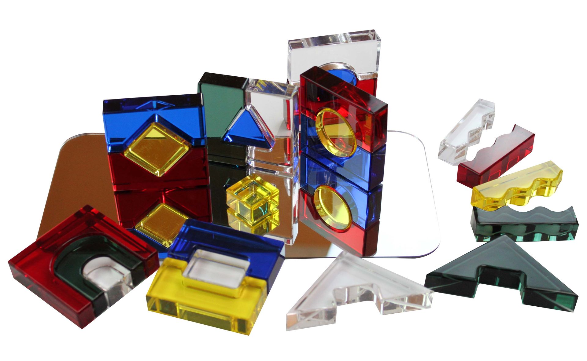 Die bunten Blöcke aus Acrylglas in 5 verschiedenen Farben werden in komplementären Formen geliefert, die sich ideal miteinander verbinden lassen. So können die Kinder selbstständig kreative Bauwerke zaubern und dabei ihr Verständnis von Formen sowie ihre Geschicklichkeit schulen. Ein besonderes Highlight des Bau-Sets ist der Spiegel, welcher im Lieferumfang enthalten ist. Darin spiegeln sich die polierten Bausteine und bilden faszinierende optische Effekte mit den Türmen aus den farbigen Bauklötzen. So macht das Bauen und Gestalten mit dem Set gleich doppelt so viel Spaß!