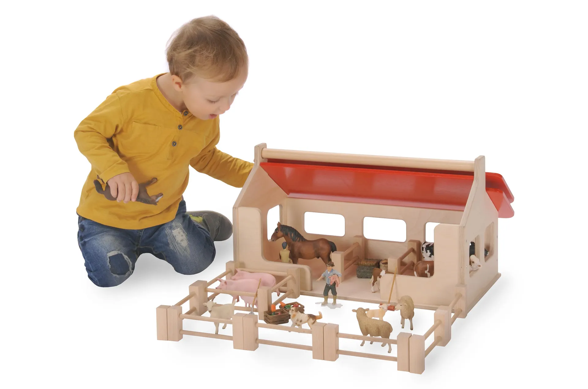 Das Bauernhof-Set besteht aus einem zentralen Stallgebäude, das den Mittelpunkt des Geschehens bildet. Seine robuste Bauweise aus Holz ist nicht nur nachhaltig, sondern auch langlebig genug, um den täglichen Abenteuern junger Landwirte standzuhalten. Die Maserung des Holzes und die sanften Erdtöne fügen sich harmonisch in die szenische Darstellung eines Bauernhofes ein und vermitteln ein authentisches Spielgefühl.