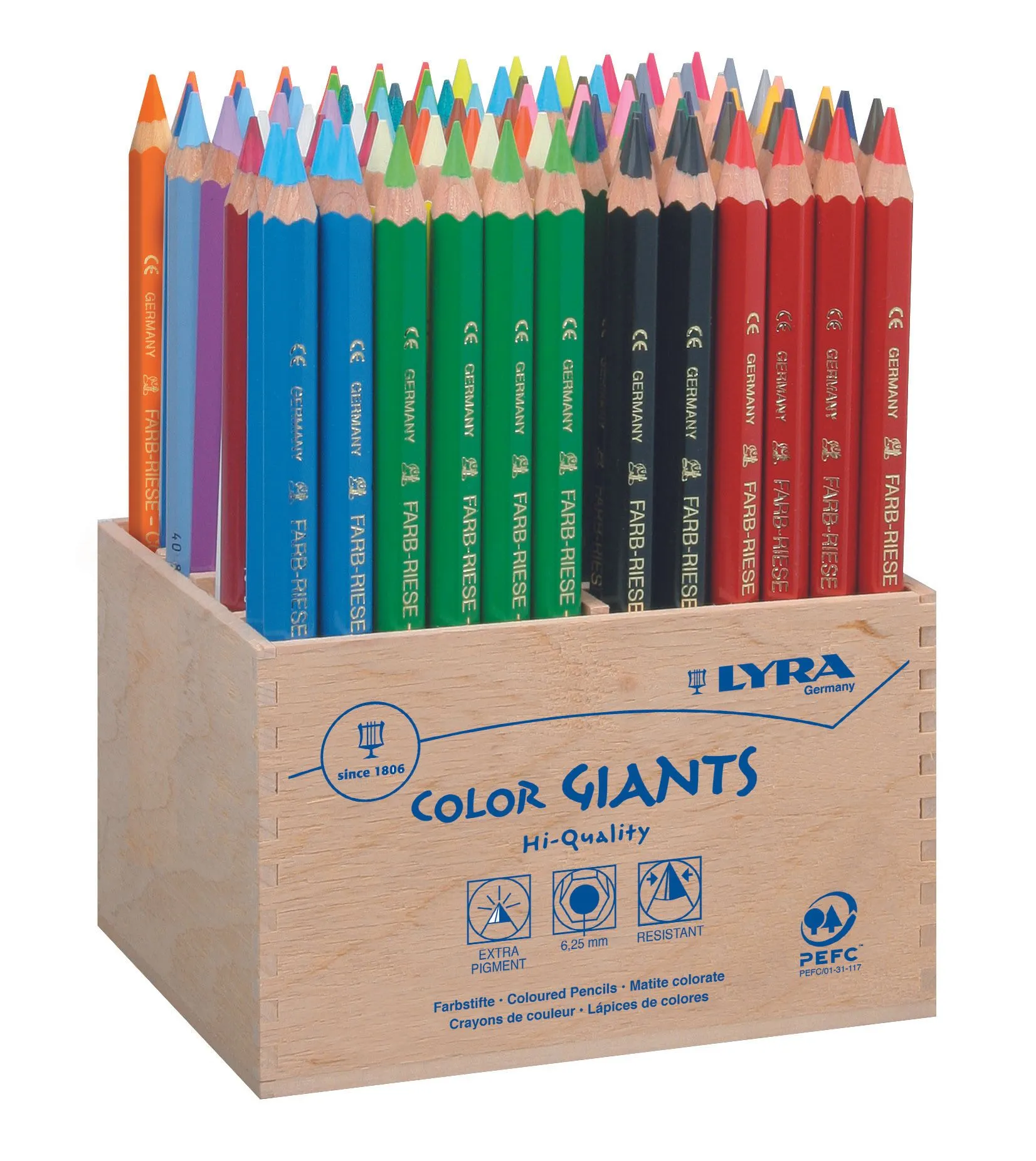 DieFarb-Riesen bunt bringen ein Stück Natur für die gesamte Klasse in das Klassenzimmer. Die hexagonalen Farb-Riesen Natur werden aus unbehandeltem und PEFC-zertifiziertem Holz hergestellt und liegen mit einem Durchmesser von 10 mm besonders gut in der Hand der Kinder. Alle Stifte sind besonders farbintensiv und haben eine 6,3 mm starke Mine, die selbst größeren Druck aushält.