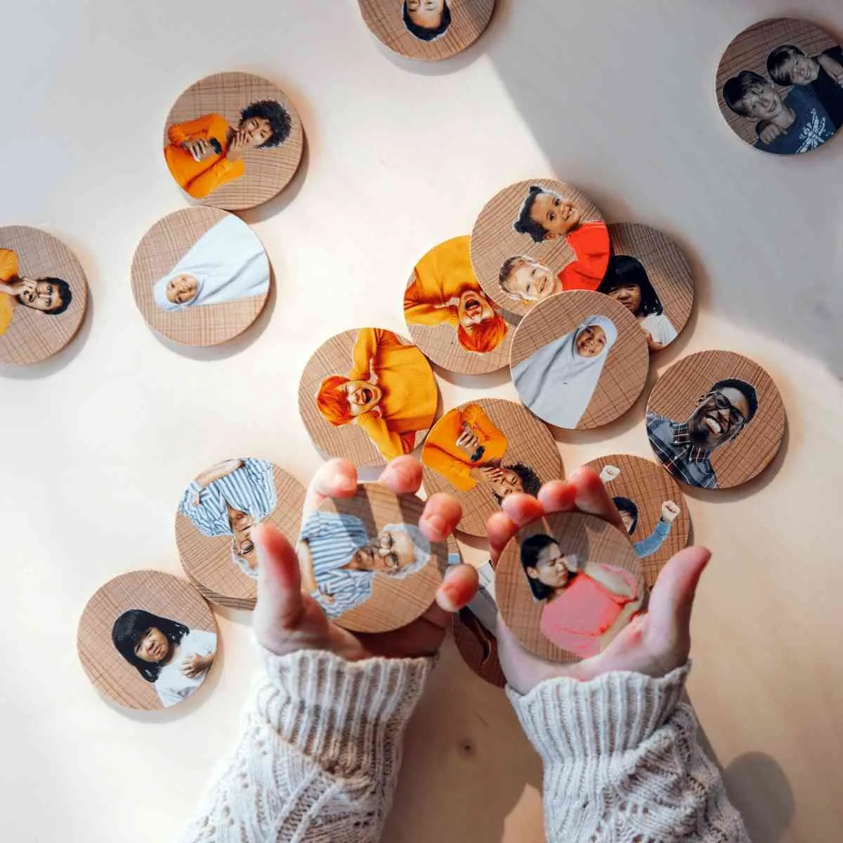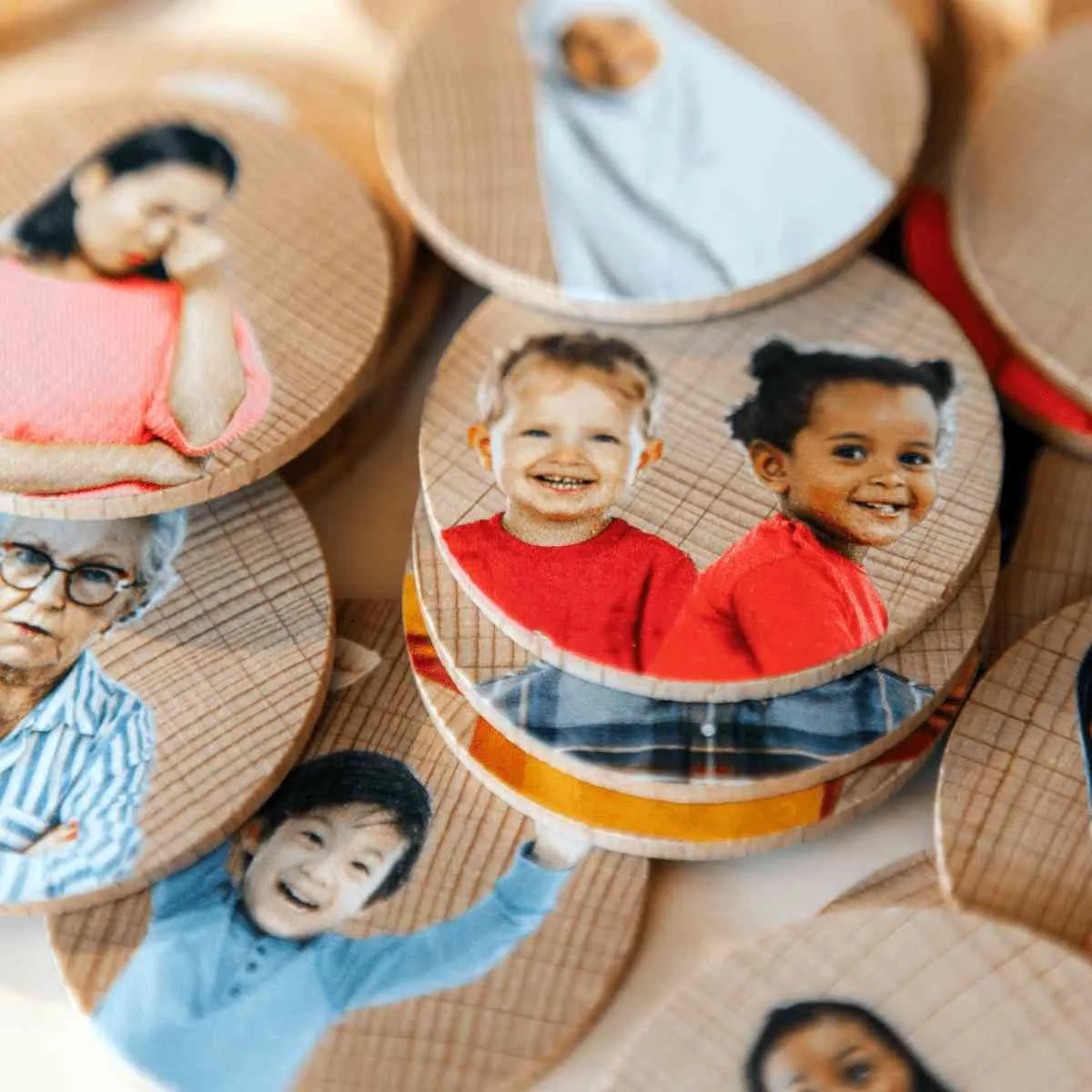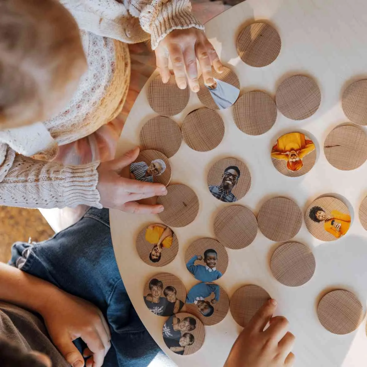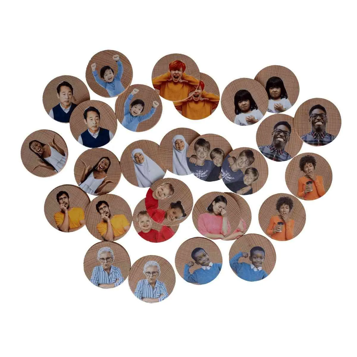 Jede der runden Holzscheiben zeigt ein einzigartiges Gesicht mit einer eigenen Emotion – von glücklich und stolz über traurig und frustriert bis hin zu aufgeregt oder verwirrt. So lernen Kinder, emotionale Signale zu deuten, Ausdrücke einander zuzuordnen und Schritt für Schritt einen Wortschatz rund um ihre eigenen Gefühle aufzubauen.
