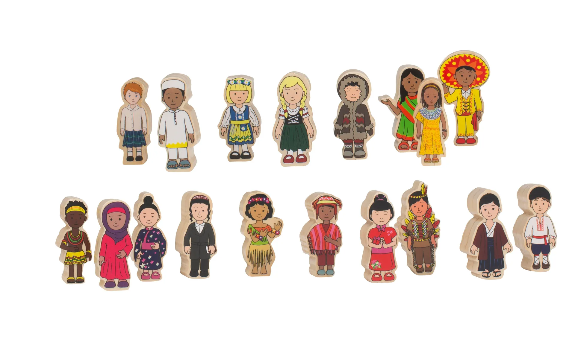 Dieses farbenfrohe Set, bestehend aus FSC-zertifizierter neuseeländischer Kiefer, ist schon für Kinder ab einem Jahr geeignet. Die ca. 6 cm hohen und 2 cm dicken Figuren aus Holz sind mittels unbedenklichen Thermotransferverfahren bedruckt. Eine matte Klarlack-Schicht schützt das Erscheinungsbild der Figuren. Das Set umfasst insgesamt 18 Kulturen.
