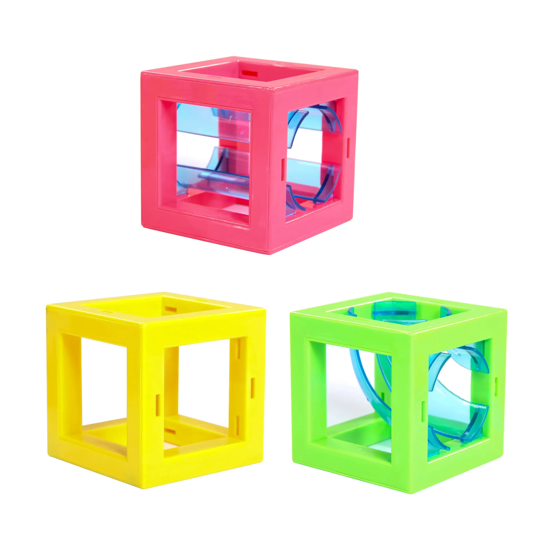 Die Holzkugel startet ihren Weg im Turm, saust die lange Bahn herunter, gelangt durch einen Tunnel eine Etage tiefer, rollt von einem in den nächsten Würfel und erreicht über eine lange Kurve umjubelt ihr Ziel. Diese Kugelbahn bietet immer neue Variationen! Die einzelnen Elemente in Gelb, Grün, Rot und Blau sind magnetisch, lassen sich frei kombinieren und zusammensetzen. Das Set ist umfangreich. Es besteht aus 38 Würfeln, die mal leer, mal mit einem rechten Winkel oder einer geraden Strecke gefüllt sind. Dazu gibt es acht lange und sechs kurze, jeweils blaue, durchsichtige Bahnen sowie insgesamt acht Kurvenbahnen im gleichen Design. Komplettiert wird das Set durch vier Starter, zwei Türme und zwei passende Holzkugeln.