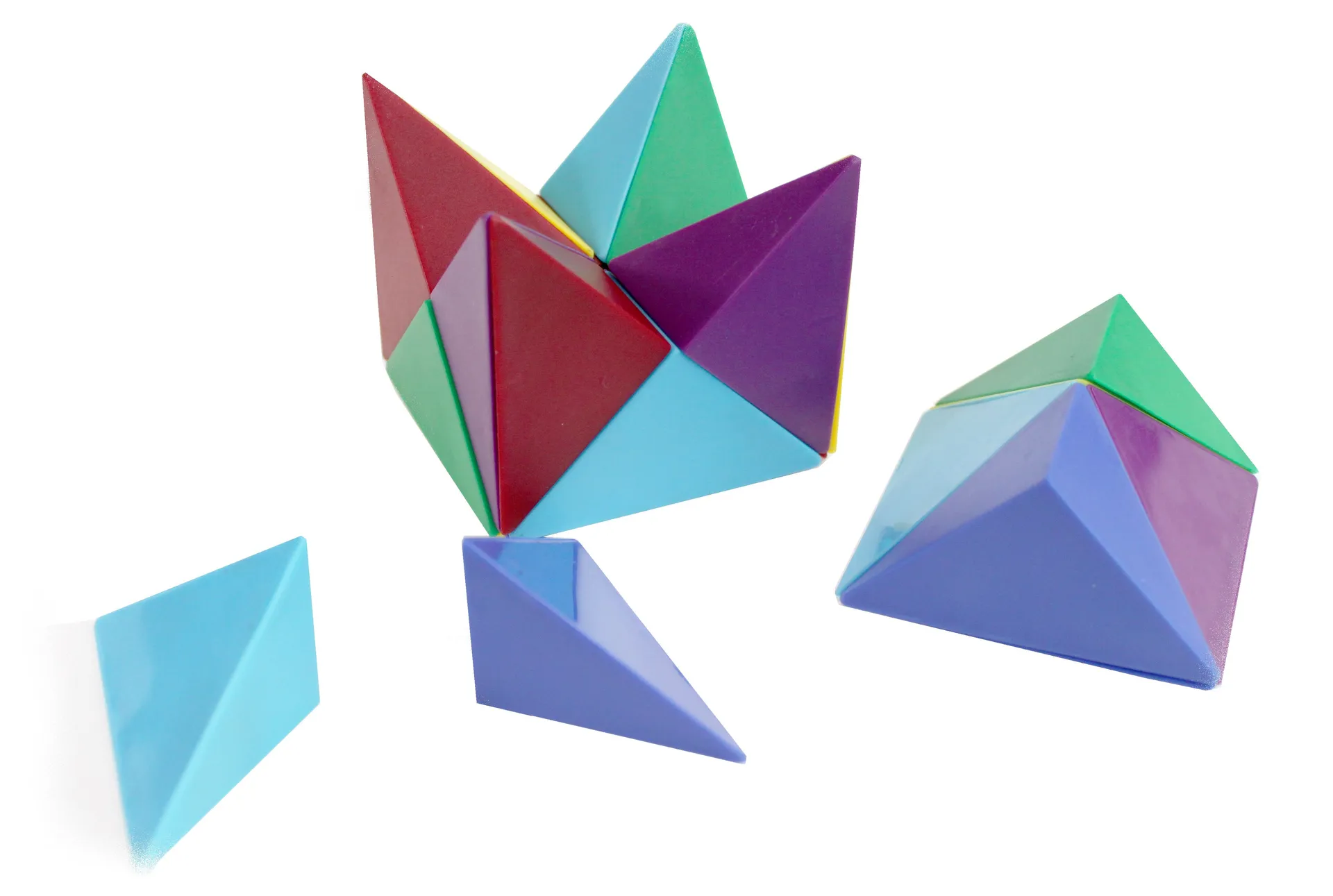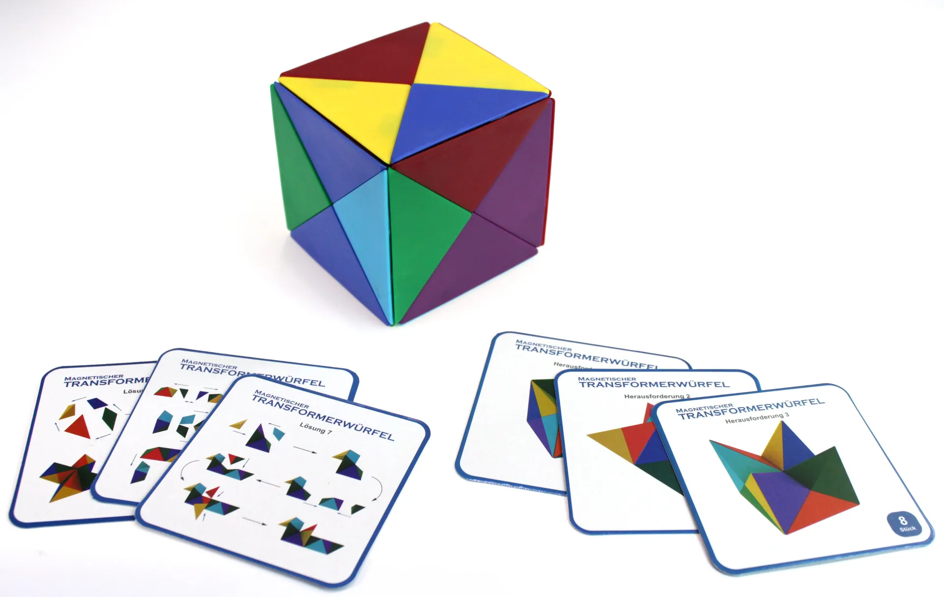 Beim Transformerwürfel handelt es sich um 24 Dreiecke in Pyramidenform, die ineinander zusammengefügt die quadratische Ausgangsform des Würfels mitbringen. Daraus lassen sich mit etwas Geschicklichkeit und jeder Menge Fantasie die verschiedensten Figuren legen. Der Würfel orientiert sich am chinesischen Legespiel Tangram. Die einzelnen Dreiecke sind magnetisch, sodass sie gut aneinander haften. Schon die Kleinsten formen daraus geometrische Figuren, die im Anschluss zum kreativen Spielen einladen. Es besteht aber auch die Möglichkeit, bestimmte Objekte wie zum Beispiel ein Schiff aus einer Auswahl an Dreiecken zu legen. Zum Einstieg ins kreative Spiel kommt der Transformerwürfel mit 12 Beispielkarten mit einfachen Legevorschlägen daher.